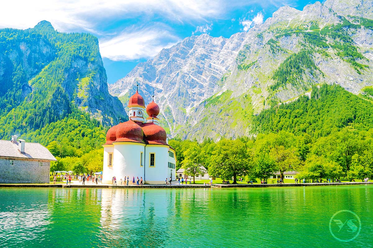 國王湖-德奧邊界不遠巴伐利亞邦內美麗而清澈的國王湖區,位於瓦茨曼峰山腳,湖面狹長,兩岸群峰環繞,山高水深,既有北歐峽灣之峻峭、壯闊,亦富歐洲山林修道院之典雅。四周嚴峰峭壁和蒼翠樹木環抱,幽靜而神秘。